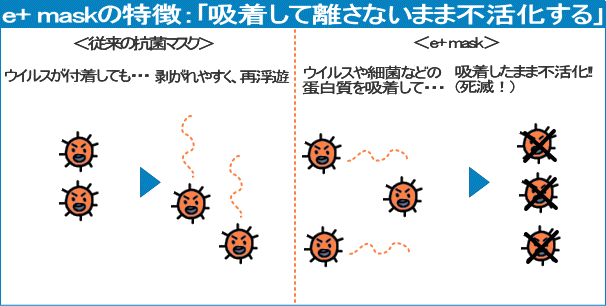「吸着して離さないまま不活化する」・・・つまり、ウイルスが死滅する為、二次感染の不安がなくなります。e+(アースプラス)はウィルス接触後、約30分で吸着し120分後には、ウィルスを分解することが証明されました。
