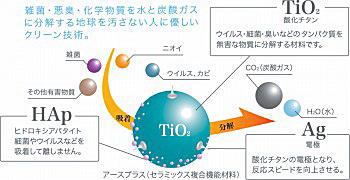これは人間の骨の成分と同じであり、あの「芸能人は歯が命」でお馴染みの成分です。この成分は有機物を吸着する機能があります。 これで空気中のウィルス・細菌・臭いなどを吸着します。